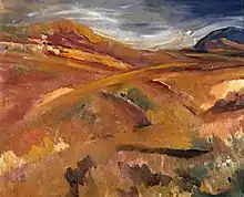 Expelled from the Slade in the Summer of 1913, Bomberg formed a series of loose affiliations with several groups involved with the contemporary English avant-garde, embarking on a brief and acrimonious association with the Bloomsbury Group's Omega Workshops before exhibiting with the Camden Town Group in December 1913. His enthusiasm for the dynamism and aesthetics of the machine age gave him a natural affinity with Wyndham Lewis's emerging vorticist movement, and five of his works featured in the founding exhibition of the London Group in 1914.[7] Still, Bomberg was staunchly independent and despite Lewis' attempts he never officially joined Vorticism.[5] In July 1914 he refused involvement with the Vorticist literary magazine BLAST and in June of the following year his work featured only in the "Invited to show" section of the vorticist exhibition at London's Dore Gallery. In 1914 he met his first wife Alice Mayes a resourceful and practical woman about ten years older than him who had worked with Kosslov's Ballet Company. Their mutual interest in experimental dance and the Russian ballet may have helped bring them together. Alice helped Bomberg in the early part of his career both with financial support and in influencing his appearance and character. 1914 saw the highpoint of his early career – a solo exhibition at the Chenil Gallery in Chelsea which attracted positive reviews from Roger Fry and T. E. Hulme and attracted favourable attention from experimental artists nationally and internationally.[10] The exhibition featured several of Bomberg's early masterpieces, most notably The Mud Bath (1914), which was hung on an outside wall surrounded by Union Flags – causing "the horses drawing the 29 bus... to shy at it as they came round the corner of King's Road."[12]