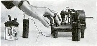 Hughes seems to have come across the phenomenon of radio waves nine years before they were proven to exist by Heinrich Hertz in 1888.[3][6] In 1879 while working in London Hughes discovered that a bad contact in a Bell telephone he was using in his experiments seemed to be sparking when he worked on a nearby induction balance.[6][10][11] He developed an improved detector to pick up this unknown "extra current" based on his new microphone design and developed a way to interrupt his induction balance via a clockwork mechanism to produce a series of sparks. By trial and error experiments he eventually found he could pick up these "aerial waves" as he carried his telephone device down the street out to a range of 500 yards (460 m).[6]