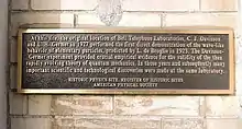 In 1927 at Bell Labs, Clinton Davisson and Lester Germer fired slow moving electrons at a crystalline nickel target. The angular dependence of the reflected electron intensity was measured and was determined to have the same diffraction pattern as those predicted by Bragg for X-rays. At the same time George Paget Thomson independently demonstrated the same effect firing electrons through metal films to produce a diffraction pattern, and Davisson and Thomson shared the Nobel Prize in Physics in 1937.[2][4] The Davisson–Germer experiment confirmed the de Broglie hypothesis that matter has wave-like behavior. This, in combination with the Compton effect discovered by Arthur Compton (who won the Nobel Prize for Physics in 1927),[5] established the wave–particle duality hypothesis which was a fundamental step in quantum theory.