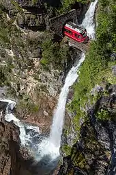 The Wiesen station is far below the village it is named after. Immediately after the station, the line runs over the 210 m (690 ft) long and 89 m (292 ft) high Wiesen Viaduct, which is Rhaetian Railway's largest stone bridge. The line then traverses the remaining section to the Filisur station, far above the deep Landwasser gorge on a slope.
