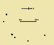 Passmore probed the ground with an iron bar to ascertain the location and dimensions of various stones in the circle.[18] He also dug into the space between those stones he numbered four and five, discovering a piece of burnt sarsen and patch of white ash beneath the ground, evidence for the burning and cracking of sarsen on the site.[18] He observed that the western part of the circle was largely occupied by cow yards and rick yards and suggested that most of the stones in this area had been broken up or removed.[18] He commented on the presence of some "big fragments" of sarsen lying around the vicinity and an area of sarsen paving, suggesting that these stones had once been part of the circle before being removed and repurposed.[18]