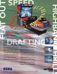 ![]() Daytona USA arcade flyer with the deluxe cabinet pictured | |