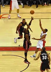 The Raptors finished the regular season as the second seed in the Eastern Conference with a 56–26 record. In the first round of the playoffs, the Raptors faced the seventh-seeded Indiana Pacers, and in a Game 5 win on April 26, DeRozan scored 34 points to help the Raptors take a 3–2 series lead.[31] In Game 7 of the series, DeRozan scored 30 points to help the Raptors win a best-of-seven series for the first time in franchise history. With a 4–3 series victory over the Pacers, the Raptors moved on to the second round to face the Miami Heat.[32] In Game 5 of the Raptors' series with the Heat, DeRozan again scored 34 points to help the Raptors take a 3–2 series lead with a 99–91 win.[33] In Game 7 of the series, he scored 28 points in a 116–89 win over the Heat, helping the Raptors advance to the conference finals for the first time in franchise history.[34] In Game 4 of the Eastern Conference Finals against the Cleveland Cavaliers, DeRozan scored 32 points to help the Raptors win 105–99 and tie the series at 2–2.[35] The Raptors went on to lose the next two games to bow out of the playoffs with a 4–2 defeat.