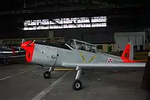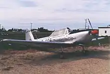 The de Havilland Canada DHC-1 Chipmunk is a two-seat, single-engine aircraft that has been heavily used as a primary trainer aircraft.[1][4] The basic configuration of the aircraft included a low-mounted wing and a two-place tandem cockpit, which was fitted with a clear perspex canopy covers the pilot/student (front) and instructor/passenger (rear) positions and provided all-round visibility.[1] The Chipmunk uses a conventional tailwheel landing gear arrangement and is fitted with fabric-covered flight control surfaces; the wing is also fabric-covered aft of the spar.[9][1] In terms of handling, the Chipmunk exhibited a gentle and responsive flight attitude. Early production aircraft were only semi-aerobatic, while later production models were almost all fully aerobatic.[1][9]