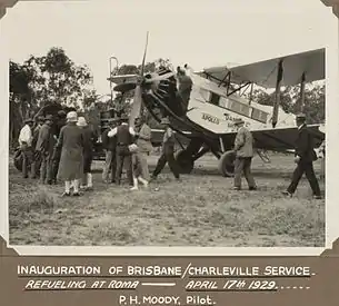 The arrival of QANTAS DH.61 'Apollo,' bringing the first air mail to Brisbane on 23 April 1929. Notice the pilot's open cockpit behind the wings.