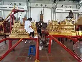 On 19 November the Ministry of Culture's Fine Arts Department head Anant Chuchote visited Nakhon Pathom, where the royal funeral urns have been manufactured for centuries out of old sandalwood trees. He asked for public support and assistance for the making of the royal urn alongside 150 artisans from the Traditional Arts Office.[44] The department issued a job hiring call in the middle of January 2017 for prospective workers in the Sanam Luang royal crematorium complex and for the needed chariot repair and upgrading works.[45]