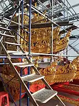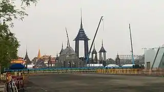 Designs for the cremation complex were officially unveiled on 28 October 2016, and a special ceremony was held on 19 December for the royal funeral chariots to be used at the Bangkok National Museum.[38][39][40] The construction work for the complex officially commenced on 27 February 2017 with the building of the central column with a September target completion date.[41][42] The crematorium was the biggest, largest and tallest yet since the state cremation rites for King Rama V (Chulalongkorn) in 1911, and unlike past state cremations, will be at the larger northern segment of the Sanam Luang Royal Square instead of the southern segment where cremations were held before.[43]