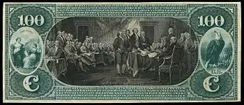 Trumbull's Declaration of Independence signing scene painting has been depicted several times on United States currency and postage stamps. It was first used on the reverse side of the $100 National Bank Note that was issued in 1863.[3] The depiction was engraved by Frederick Girsch of the American Bank Note Company.[4] The same steel engraving was used on the 24¢ stamp issued six years later as part of the 1869 pictorial series of definitive U.S. postage stamps.[5]