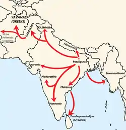 Buddhism spread across ancient India and state support by various regional regimes continued through the 1st-millennium BCE.[9] The consolidation of the monastic organisation made Buddhism the centre of religious and intellectual life in India.[10] The succeeding Kanva Dynasty had four Buddhist Kanva Kings.[11]