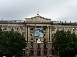 On 9 April 2015, the Ukrainian parliament passed legislation on decommunization.[16] It was submitted by the Second Yatsenyuk Government, banning the promotion of symbols of "Communist and National Socialist totalitarian regimes".[17][18] One of the main provisions of the bill was the recognition of the Soviet Union was "criminal" and one that it "pursued a state terror policy".[18] The legislation prohibits the use of Communist symbols and propaganda and also bans all symbols and propaganda of national-socialism and its values and any activities of Nazi or fascist groups in Ukraine.[18] The ban applies to monuments, place and street names.[4] The ban does not apply to World War II monuments and when symbols are located in a cemetery.[4][8] Expressing pro-communist views was not made illegal.[2] The ban on communist symbols did result in the removal of hundreds of statues, the replacement of millions of street signs and the renaming of populated places including some of Ukraine's biggest cities like Dnipro.[4] The city administration of Dnipro estimated in June 2015 that 80 streets, embankments, squares, and boulevards would have to be renamed.[19] Maxim Eristavi of Hromadske.TV estimated late April 2015 that the nationwide renaming would cost around $1.5 billion.[12] The legislation also granted special legal status to veterans of the "struggle for Ukrainian independence" from 1917 to 1991 (the lifespan of the Soviet Union).[17] The same day, the parliament also passed a law that replaced the term "Great Patriotic War" in the national lexicon with "World War II" from 1939 to 1945,[17][20] a change of great significance.[21]