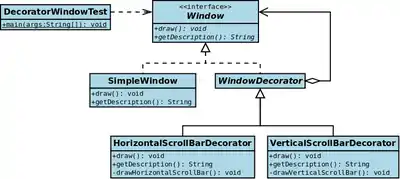 In the previous example, the SimpleWindow and WindowDecorator classes implement the Window interface, which defines the draw() method and the getDescription() method that are required in this scenario, in order to decorate a window control.