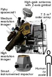 The Flyby spacecraft is about 3.3 meters (10.8 ft) long, 1.7 meters (5.6 ft) wide and 2.3 meters (7.5 ft) high.[3][6] It includes two solar panels, a debris shield, and several science instruments for imaging, infrared spectroscopy, and optical navigation to its destination near the comet. The spacecraft also carried two cameras, the High Resolution Imager (HRI), and the Medium Resolution Imager (MRI). The HRI is an imaging device that combines a visible-light camera with a filter wheel, and an imaging infrared spectrometer called the "Spectral Imaging Module" or SIM that operates on a spectral band from 1.05 to 4.8 micrometres. It has been optimized for observing the comet's nucleus. The MRI is the backup device, and was used primarily for navigation during the final 10-day approach. It also has a filter wheel, with a slightly different set of filters.