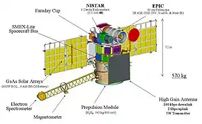 DSCOVR is built on the SMEX-Lite spacecraft bus and has a launch mass of approximately 570 kg (1,260 lb). The main science instrument sets are the Sun-observing Plasma Magnetometer (PlasMag) and the Earth-observing NIST Advanced Radiometer (NISTAR) and Earth Polychromatic Imaging Camera (EPIC). DSCOVR has two deployable solar arrays, a propulsion module, boom, and antenna.[20]