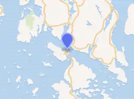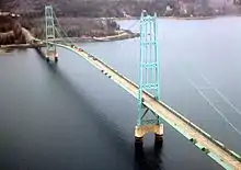 The Deer Isle Bridge is a suspension bridge spanning Eggemoggin Reach in the state of Maine. The bridge is the only vehicular connection from the Maine mainland to Little Deer Isle, one of the segments that make up the island. The span was completed in March 1939 with a main span of 1,088 feet (332 m). The bridge was designed by Holton Duncan Robinson and David Bernard Steinman. It encountered wind stability problems that were similar to those of the Whitestone Bridge and the original Tacoma Narrows Bridge, which collapsed shortly after it opened. The problems led to modifications which included numerous cable stays connecting cables to the tower and tower to the deck. The span today carries two narrow lanes of State Route 15.[1]