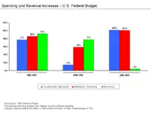 Historically, government spending increased year-over-year in nominal (i.e., unadjusted for inflation) terms from 1971 to 2009. However, by limiting the rate of growth in discretionary spending (defense and non-defense) while growing revenues, the budget was balanced from 1998–2001. From 1990 to 1999, discretionary spending grew by a total of 14%, while revenues grew 77%. In contrast, from 2000–2009, discretionary spending grew by a total of 101% while revenues grew only 4% (see graphic at right).[35] Though a balanced budget is ideal, allowing down payment on debt and more flexibility within government budgeting, limiting deficits to within 1% to 2% of GDP is sufficient to stabilize the debt.