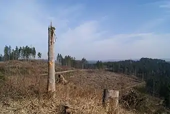 Reforestation is the natural or intentional restocking of existing forests and woodlands that have been depleted, usually through deforestation. It is the reestablishment of forest cover either naturally or artificially.[54] Similar to the other methods of forestation, reforestation can be very effective because a single tree can absorb as much as 22 kilograms (48 lb) of carbon dioxide per year and can sequester 0.91 tonnes (1 short ton) of carbon dioxide by the time it reaches 40 years old.[55]