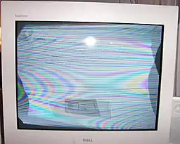 Color CRT displays, the technology underlying television and computer monitors until recently, use degaussing. Many CRT displays use a metal plate near the front of the tube to ensure that each electron beam hits the corresponding phosphors of the correct color. If this plate becomes magnetized (e.g. if someone places a magnet on the screen), it imparts an undesired deflection to the electron beams and the displayed image becomes distorted and discolored.