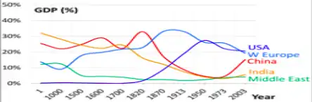 In the period between 1775-1800, significant innovations occurred in the British cotton industry which increase their total output and the cost of the production declined. It created significant challenges for the Indian produced cotton which was high in prices. In addition, during this time period, the control and influence of British increased in the eastern region of the globe and their control on Indian sub-continent increased significantly. Furthermore, the policies of the British rulers of these colonies considered the need of increasing the market for British produced cotton.[3] The British cotton was often produced in surplus quantity by using sophisticated machinery and was exported to the British colonies. The British cotton faced unequal competition from the indigenous cotton industry of the colonies. The prices of the British cotton industry were reduced to significantly to increase the dominance of the British cotton.[4] It led to a decline in the indigenous cotton industry of the colonies and the domestic activities associated with the production of Indian cotton fell. The fall of the Indian cotton industry is one of the important factors behind the decline of Indian GDP under the British Rule. The standard of living of British increased from the middle of the seventeenth century and in the same period, the standard of living India decreased significantly. During the 1600s, the Indian GDP was 60 percent of the British GDP and by the end of the 19th century it decreased to less than 15 percent in comparison.[7]
