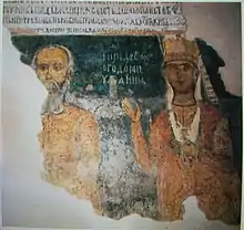 On April 16, 1346 (Easter), Stefan Dušan convoked a huge assembly at Skopje, where the autocephalous Serbian Archbishopric was raised to the status of a Patriarchate.[4] The new Patriarch Joanikije II now solemnly crowned Dušan as "Emperor (basileus) and autocrat of Serbs and Romans (Greeks)".[4] Dušan had his son Uroš V crowned King of Serbs and Greeks, giving him nominal rule over the Serbian lands, and although Dušan was governing the whole state, he had special responsibility for the "Roman", i.e. Greek lands.[4] A further increase in the Byzantinization of the Serbian court followed, particularly in court ceremonial and titles.[4] In the years that followed, the Serbian nobility were elevated: Dušan's half-brother Simeon Uroš, brother-in-law Jovan Asen and Jovan Oliver were granted the title of despot. His brother-in-law Dejan and Branko were granted the title of sevastokrator. The military commanders (voivodes) Preljub, Vojihna and Grgur received the title of ćesar.[5][6][7] The raising of the Serbian Patriarchate resulted in the same spirit - bishops became metropolitans.[5]