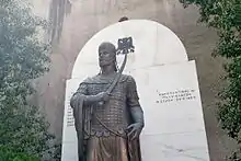 Konstantin married, but his spouse's name is unknown,[41] and from this marriage Konstantin had a daughter, Jelena, who in 1392 married Byzantine Emperor Manuel II Palaiologos (r. 1391-1425).[41][42] Manuel II and Jelena had several children, among whom were the last Byzantine Emperors John VIII (r. 1425-1448) and Constantine XI (r. 1449-1453).[46] Constantine XI, the last Byzantine Emperor,[47][48][49] who died defending Constantinople from the Ottomans in 1453, was known by his mother's surname, in Greek, Dragáses (Δραγάσης).[50] Constantine XI was named after his grandfather.[51]
