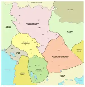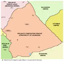 - ^ It is known in historiography as the province of the Dejanović family (Serbian: област Дејановића) or province of the Dragaš family (област Драгаша). In Bulgarian sources it has also been rarely referred to as Duchy of Velbazhd (Bulgarian: Велбъждско княжество), Duchy of Kyustendil (Кюстендилско княжество) and Duchy of the Dragaš (Княжество на Драгаши[55]).