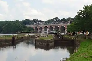 Locks were used to overcome elevation differences along the D&R canal. Many of the locks are still present along the canal route; however, the lock gates have been replaced on the upstream side with small dams and water outfalls. The downstream gates have been removed, so the water in the locks is level with the water on the downstream side. Some of the locks have been buried or removed due to construction projects in the vicinity of the canal.