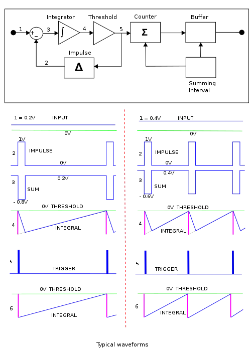 A delta-sigma or other pulse-density or pulse-frequency modulator generates a pulse stream in which the frequency, f, of pulses in the stream is proportional to the analog voltage input, v, so that f = k · v, where k is a constant for the particular implementation. A feedback loop monitors the integral of v and when that integral has incremented by Δ, which is indicated by the integral waveform crossing a threshold, T, it subtracts Δ from the integral of v so that the combined waveform sawtooths between T and T − Δ. At each step a pulse is added to the pulse stream.