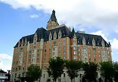 Châteauesque features found on the hotel include oriel windows, rounded turrets, quoins, string courses, and machicolations on the hotel's walls.[7] The roof of the hotel features Gothic Revival dormers with carved tympana are spread throughout.[7] A variety of different grotesque are also spread throughout the building.[8] Materials used in construction were of Canadian origin, including Tyndall stone from Manitoba, brick from the Claybank Brick Plant in Claybank, Saskatchewan, and tiles from Estevan, Saskatchewan.[9] The interior of the hotel features ceiling moulds, plaster reliefs, and terrazzo floors.
