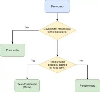 The first distinction made is whether a democracy's government is responsible to the legislature. If it is not responsible, it is a presidential democracy. If it is, then a further distinction is made between democracies where the head of state is popularly elected and those where the head of state is not popularly elected. If the head of state is popularly elected for a fixed term then, the democracy is mixed or semi-presidential. If the head of state serves for life or is not popularly elected or a fixed term, then the democracy is parliamentary.[8]