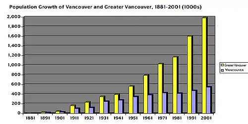 The following table shows the development of the number of inhabitants according to census data of Statistics Canada. The former municipalities of Point Grey and South Vancouver are not included in the data prior to 1931.[1][lower-alpha 1]