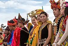 Kadazan-Dusun is the largest indigenous group in Sabah, comprising the blending of two groups with 40 sub-groups.[23][21] Every sub-groups has different language and tradition although they can understand each other. The term Kadazan-Dusun is commonly used to refer to the Kadazan and Dusun peoples.[24] Although the term are mainly used to unifying the two groups, it is also include the other sub-groups including the Murut, Orang Sungai, Rungus, Tidong and Lun Bawang/Lun Dayeh peoples.[25] Nowadays, the Kadazans are mainly reside in urban areas, while Dusun often reside in the hills and upland valleys.[23] The Kadazans are mostly settled the area around Penampang, Papar, Ranau, Tambunan and Keningau while the Dusuns are mostly concentrated in the area of Tuaran, Ranau and also Tambunan.[26] They are once known for their headhunting practice as well for their occupation as farmers, hunters and river fishers.[23][27]