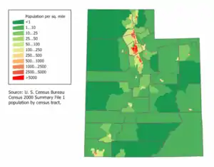 The center of population of Utah is located in Utah County in the city of Lehi.[4] As of April 1, 2010 the 2010 Census indicated that Utah had a population of 2,763,885.[5] In 2008, the U.S. Census Bureau determined Utah was the fastest-growing state in the country.[6]