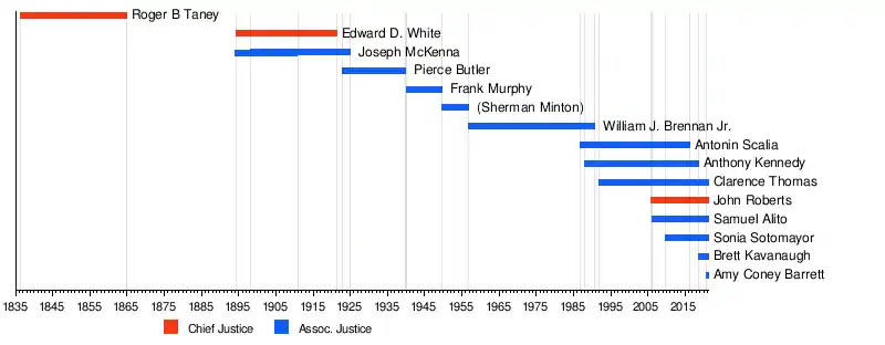 The majority of white justices have been Protestants of British ethnicity. There have been several justices of Irish or Ulster Irish descent, with William Paterson born in Ireland to an Ulster Scots Protestant family and Joseph McKenna, Edward Douglas White, Pierce Butler, Frank Murphy, William J. Brennan Jr., Anthony Kennedy, and Brett Kavanaugh being of Irish Catholic origin. There have been five Justices of French ancestry in John Jay, Gabriel Duval, Lucius Quintus Cincinnatus Lamar, Joseph Rucker Lamar[18] and Amy Coney Barrett, with all except the Catholic Barrett being Huguenots. Two Justices – William Johnson and Willis Van Devanter – have been of Dutch Protestant origin,[18] whilst the only two Scandinavian Americans to serve on the Court have been Chief Justices Earl Warren[18] and William Rehnquist.
