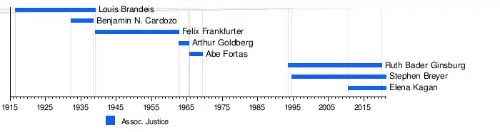 Justice Antonin Scalia, who served from 1986-2016, and Justice Samuel Alito, who has served since 2006, are the first justices of Italian descent to be appointed to the Supreme Court. Justice Scalia's father and both maternal grandparents as well as both of Justice Alito's parents were born in Italy.[21][22][23] Justice Ruth Bader Ginsburg was born to a Jewish father who immigrated from Russia at age 13 and a Jewish mother who was born four months after her parents immigrated from Poland.[24]