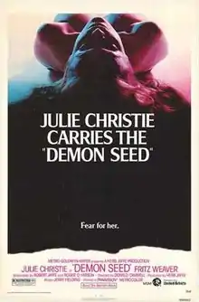 Demon Seed is a 1977 American science fiction–horror film directed by Donald Cammell. It stars Julie Christie and Fritz Weaver. The film was based on the 1973 novel of the same name by Dean Koontz, and concerns the imprisonment and forced impregnation of a woman by an artificially intelligent computer.[4] Gerrit Graham, Berry Kroeger, Lisa Lu and Larry J. Blake also appear in the film, with Robert Vaughn uncredited as the voice of the computer.[5]