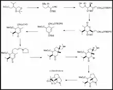 There have been 3 successful enantioselective syntheses of dendrobine reported with yields ranging from 0.2-4.0%. The structure of dendrobine is intriguing due to its tetracyclic ring system with seven contiguous stereocenters. Most recently, a full synthesis of (-)-dendrobine was carried out by Kreis et al. with a yield of 4.0%.[1] The novelty of Kreis' synthesis is the key reaction cascade with an amine functioning as the linchpin that initiates the sequence of reactions while embedding itself in the target structure. This reaction cascade occurs stereoselectively only when it is carried out without isolation of intermediates. The cascade successfully installs a key quaternary center while simultaneously designating a stereosymetric carbon center.