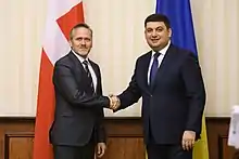 In 1918[6] or 1919,[4] the Ukrainian People's Republic was recognized by Denmark.[7] During the Danish Presidency of the Council of the European Union, Prime Minister of Denmark Anders Fogh Rasmussen welcomed Ukraine in the European Union but said that Ukraine needed more reforms before they can join the European Union.[8] In 2004, to strengthen ties with Ukraine, Denmark opened an embassy in Ukraine.[9]