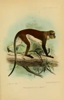Dent's mona monkey (Cercopithecus denti) is an Old World monkey in the family Cercopithecidae found in the Democratic Republic of the Congo, the Congo, Rwanda, western Uganda, and the Central African Republic.[1] It was previously classified as a subspecies of Wolf's mona monkey C. wolf.[1] Verifying whether they are a subspecies or a separate species is dependent on further research that needs to be done at the contact zone of Cercopithecus Denti, Cercopithecus Wolfi, and Cercopithecus Wolfi Elegans, in the forests between the Lualaba and Lomani rivers, south of the junction of the Congo and the Lomani rivers.[3]