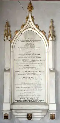 - Lucilla Rolle (1757–1851), baptised at East Tytherley, died 24 July 1851 aged 94.[2] In her old age she was allowed by her brother Lord Rolle to live with her sister Anne at Hudscott but after the latter's death and the death of Lord Rolle both in 1842 she was declared a lunatic in 1846.[7]