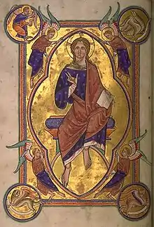 By the 5th century depictions of the Passion began to appear, perhaps reflecting a change in the theological focus of the early Church.[53] The 6th-century Rabbula Gospels includes some of the earliest surviving images of the crucifixion and resurrection.[53] By the 6th century the bearded depiction of Jesus had become standard in the East, though the West, especially in northern Europe, continued to mix bearded and unbearded depictions for several centuries. The depiction with a longish face, long straight brown hair parted in the middle, and almond shaped eyes shows consistency from the 6th century to the present. Various legends developed which were believed to authenticate the historical accuracy of the standard depiction, such as the image of Edessa and later the Veil of Veronica.[54]