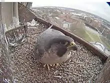 In late 2005 it was discovered that a pair of peregrine falcons had taken up residence on the cathedral tower. In 2006 a nesting platform was installed, and they nested here in April. The same pair successfully reared chicks every year up to and including 2016. However, on 27 March 2017 it became clear that a new male had taken over the nesting platform and ousted his predecessor who, by that time, was at least 14 years old. It is not known whether the first male died of old age or was chased away or killed by the new one after a fight. The female accepted the new male and together they produced four eggs, somewhat later than in previous years, three of which were successfully hatched, producing one male and two females.[16] Webcams were installed in 2007, 2008 and 2013 to enable the birds to be seen at close range without being disturbed by human contact.