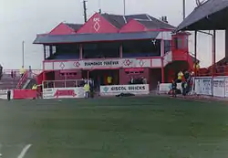 Dave Mackay first lead Derby into Europe when he took the club to a third-place finish in the 1973–74 after taking over from Brian Clough in October 1973. This was Derby's first entry into the UEFA Cup and the second round draw against Atlético Madrid marked Derby's first ever involvement in a penalty shootout; Derby won the shoot-out 7–6.[9] That success put them into the third round, in which County drew Velež.[10] After a 3–1 first leg victory at the Baseball Ground, Derby were beaten 4–1 away and eliminated as a result.[11]