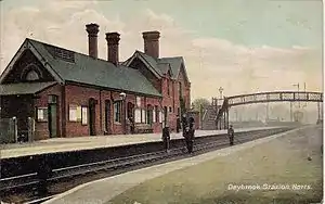 The point of convergence of the new line with the NSR line at Egginton was just beyond the existing NSR station, so that the station could not be used by GNR trains. It soon became clear that an exchange station was necessary, as was a new station at Colwick, and the decision to provide them was taken on 5 April 1878. Accordingly a new Egginton Junction station, joint with the NSR, was opened on 1 July, and from that time the old NSR station was used only for goods. An island-platform station was built at Colwick, on the Nottingham side of Colwick West junction; it was first shown in the June 1878 timetable but had probably been brought into use in May. A refreshment room was later provided.[12]