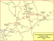 The Derbyshire and Staffordshire extension of the Great Northern Railway was an English railway network built by the GNR to get access to coal resources in the area to the north and west of Nottingham. The Midland Railway had obstructed the GNR in its attempts to secure a share of the lucrative business of transporting coal from the area, and in frustration the GNR built the line. The line was forked: it reached Pinxton in 1875 and a junction with the North Staffordshire Railway at Egginton, approaching Burton on Trent in 1878. The line cut through Derby, resulting in considerable demolition of housing there.