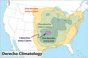 Derechos in North America form predominantly from April to August, peaking in frequency from May into July.[13] During this time of year, derechos are mostly found in the Midwestern United States and the U.S. Interior Highlands most commonly from Oklahoma and across the Ohio Valley.[9] During mid-summer when a hot and muggy air mass covers the north-central U.S., they will often develop farther north into Manitoba or Northwestern Ontario, sometimes well north of the Canada–US border.