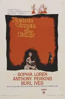 Desire Under the Elms is a 1958 American film version of the 1924 play Desire Under the Elms written by Eugene O'Neill. The film was directed by Delbert Mann from a screenplay by O'Neill and Irwin Shaw. The cast included Sophia Loren as Abbie (known as Anna in the film), Anthony Perkins as Eben, Burl Ives as Ephraim, Frank Overton as Simeon, and Pernell Roberts as Peter. The film was nominated for Best Black and White Cinematography (Daniel L. Fapp) at the Academy Awards and Laurel Awards in 1959. It was also entered into the 1958 Cannes Film Festival.[1]