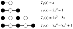 An important family of examples of Shabat polynomials are given by the Chebyshev polynomials of the first kind, Tn(x), which have −1 and 1 as critical values. The corresponding dessins take the form of path graphs, alternating between black and white vertices, with n edges in the path. Due to the connection between Shabat polynomials and Chebyshev polynomials, Shabat polynomials themselves are sometimes called generalized Chebyshev polynomials.[7][8]