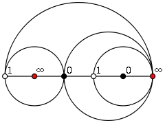 In the other direction, from this dessin, described as a combinatorial object without specifying the locations of the critical points, one may form a compact Riemann surface, and a map from that surface to the Riemann sphere, equivalent to the map from which the dessin was originally constructed. To do so, place a point labeled ∞ within each region of the dessin (shown as the red points in the second figure), and triangulate each region by connecting this point to the black and white points forming the boundary of the region, connecting multiple times to the same black or white point if it appears multiple times on the boundary of the region. Each triangle in the triangulation has three vertices labeled 0 (for the black points), 1 (for the white points), or ∞. For each triangle, substitute a half-plane, either the upper half-plane for a triangle that has 0, 1, and ∞ in counterclockwise order or the lower half-plane for a triangle that has them in clockwise order, and for every adjacent pair of triangles glue the corresponding half-planes together along the portion of their boundaries indicated by the vertex labels. The resulting Riemann surface can be mapped to the Riemann sphere by using the identity map within each half-plane. Thus, the dessin d'enfant formed from f is sufficient to describe f itself up to biholomorphism. However, this construction identifies the Riemann surface only as a manifold with complex structure; it does not construct an embedding of this manifold as an algebraic curve in the complex projective plane, although such an embedding always exists.