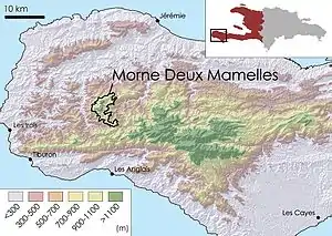 Deux Mamelles National Park (French: Parc National Naturel de Deux Mamelles) is a national park in Haiti established on September 23, 2015 with an area of 2,265 hectares.[2] It is located on the Tiburon Peninsula of Haiti, just west of a line connecting Les Anglais to the south and Jérémie to the north. The park circumscribes a U-shaped mountain, Morne Deux Mamelles, reaching 1,276 meters in elevation and is the highest mountain at the western end of the Tiburon Peninsula. Patches of the original (primary) forest remain at elevations above 1,000 meters, growing on highly dissected limestone rock.[1]