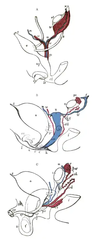 - m. Müllerian duct, the upper part of which remains as the hydatid of Morgagni; the lower part, represented by a dotted line descending to the prostatic utricle, constitutes the occasionally existing cornu and tube of the uterus masculinus.
